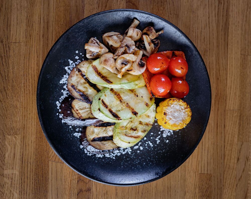 Кабачок, баклажан, перец болгарский, кукуруза, томаты черри, шампиньоны