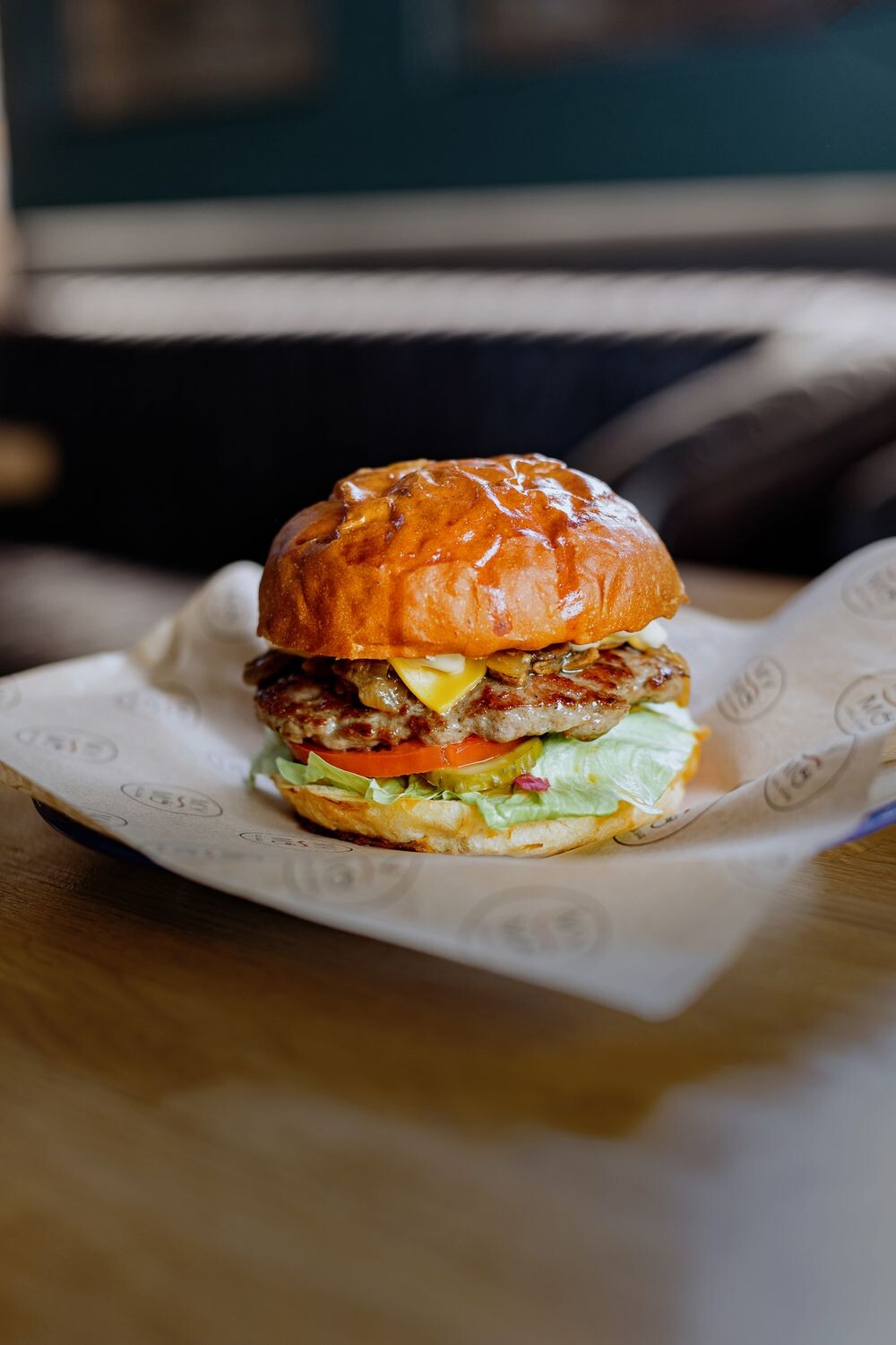 Булочка, котлета из говядины, сыр чеддер, айоли, айсберг, маринованный лук маринованные огурцы, томаты, грибной жульен