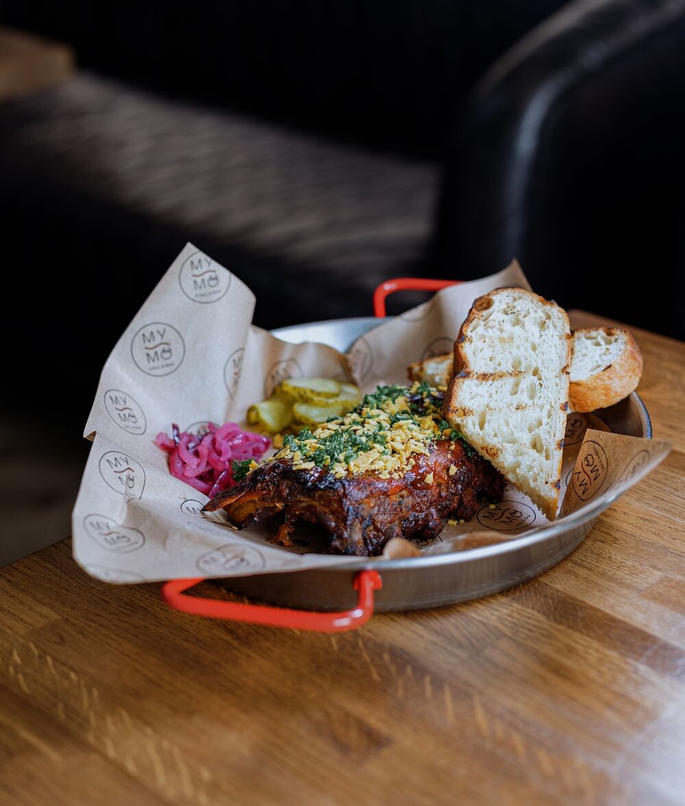 Глазированные свиные рёбра в соусе BBQ, лук маринованный, маринованные огурцы. чиабатта, начос