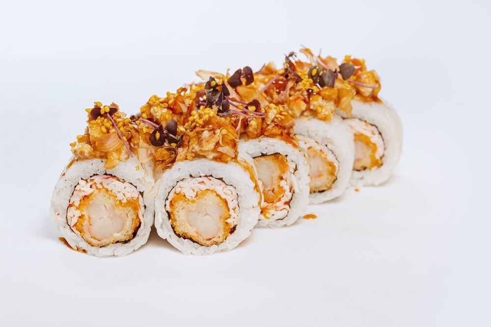 Рис, нори, краб (имитация), креветка, угорь, соус унаги понзу, миндаль, микрозелень