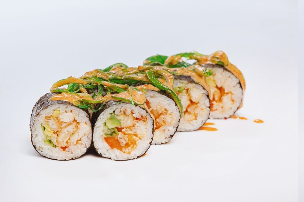 Рис, нори, курица, авокадо, огурец, болгарский перец, соус ореховый кимчи, чука, кунжут
