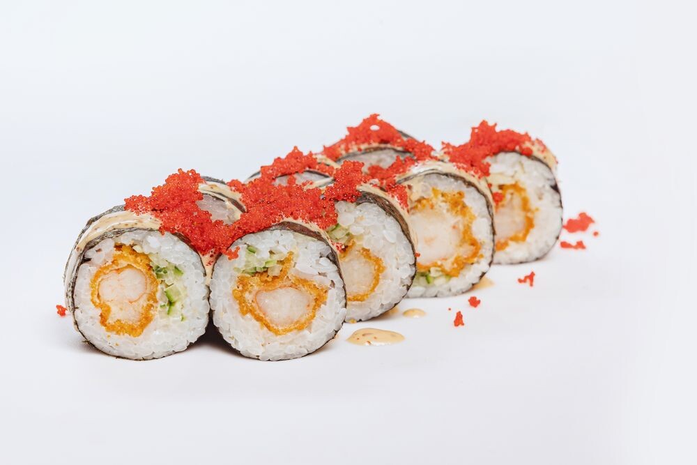 Рис, нори, сливочный сыр, креветка, огурец, соус кунжутный, икра Тобико