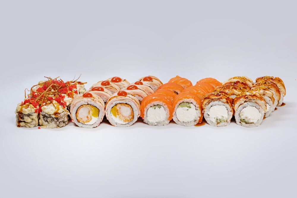 С опаленным беконом и креветкой темпура Филадельфия с угрем Филадельфия с огурцом Темпура с креветкой и соусом васаби