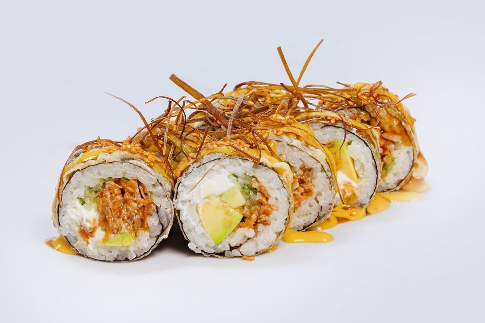Рис, нори, сливочный сыр, лосось терияки, авокадо, жареный порей, соус манго, соус унаги понзу, кунжут