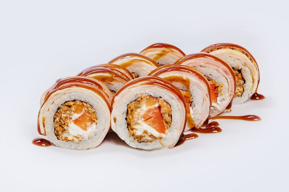 Ролл с опаленным беконом и креветкой темпура