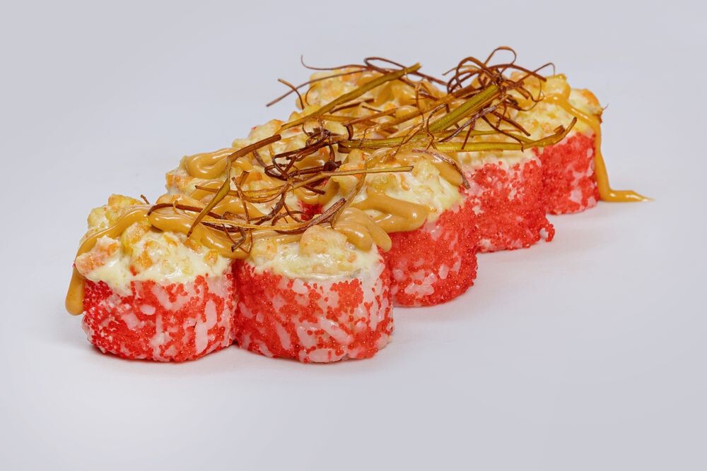 Рис, нори, сливочный сыр, лосось, креветка, огурец, икра тобико, сливочный васаби, унаги трюфельный, лук порей