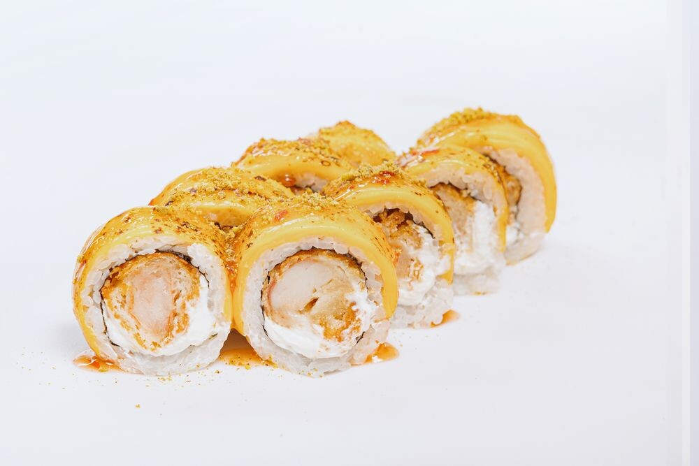 8шт/240ккал Рис, нори, сливочный сыр, креветка в темпуре, сыр чеддер, сладкий чили, фисташки, болгарский перец