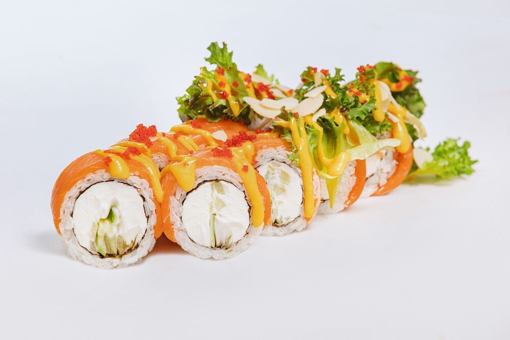 Рис, нори, сливочный сыр, лосось, огурец, микс салата, соус унаги понзу, соус манго, миндаль, икра Тобико