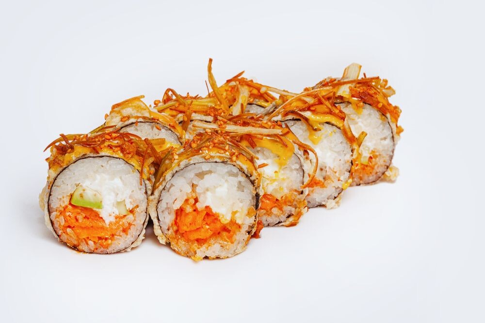 8шт Рис, нори, сливочный сыр, лосось кимчи, авокадо, жареный порей, соус манго, соус унаги понзу, кунжут